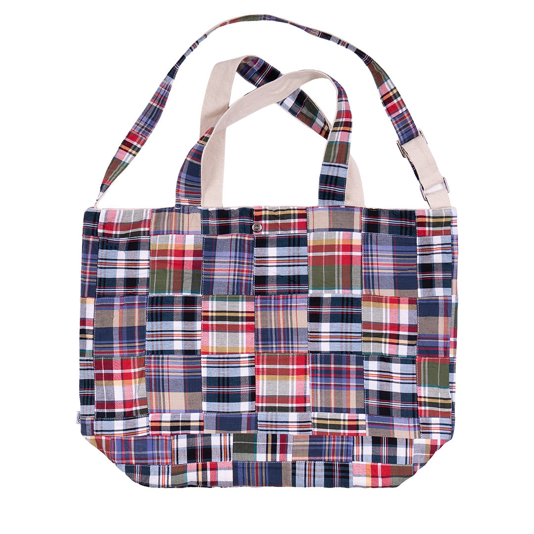 A reversible canvas tote bag with a custom madras patchwork liner, one of our favorite pieces this season. Featuring two tote straps, an adjustable messenger strap, a front pocket and internal snap button, flip this thing inside out for a totally different look.
